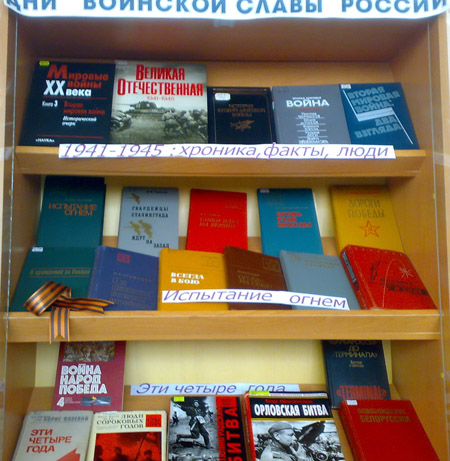 ВЫСТАВКИ, ПОСВЯЩЕННЫЕ ДНЮ ПОБЕДЫ Война: вглядываясь сквозь годы... Время пламенных лет не уйдет в забытье... Дни воинской славы России Дорогами мужества И помнит мир спасенный... Мне выпала честь прикоснуться к Победе... Нет в России семьи такой, где б не памятен был свой герой... Поэты - фронтовики Ради живущих сегодня... России верные сыны Фильмы о Великой Отечественной войне из фонда НБ ОрелГТУ Этот День Победы...